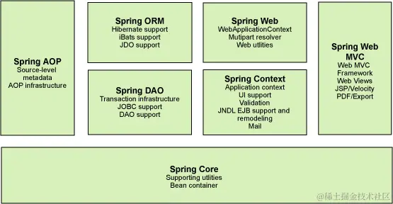 组成 Spring 框架的每个模块(或组件)都可以单独存在,或者与其他一个或多个模块联合实现。每个模块的功能如下: