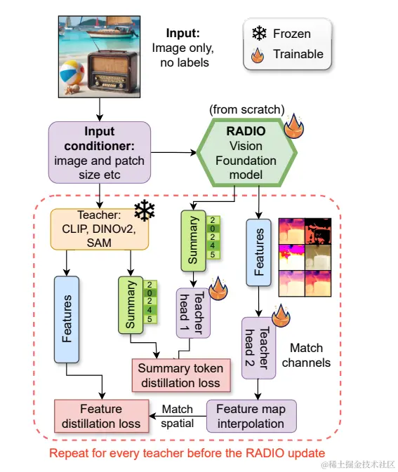 AM-RADIO 的核心技术是多教师蒸馏。简单来说,该技术将多个“教师”模型的知识转移到一个“学生”模型中,使学生模型能够学习到多个教师模型的优势。在 AM-RADIO 中,研究人员选择了 CLIP、DINOv2 和 SAM 作为教师模型,因为它们在各自的领域表现出色: