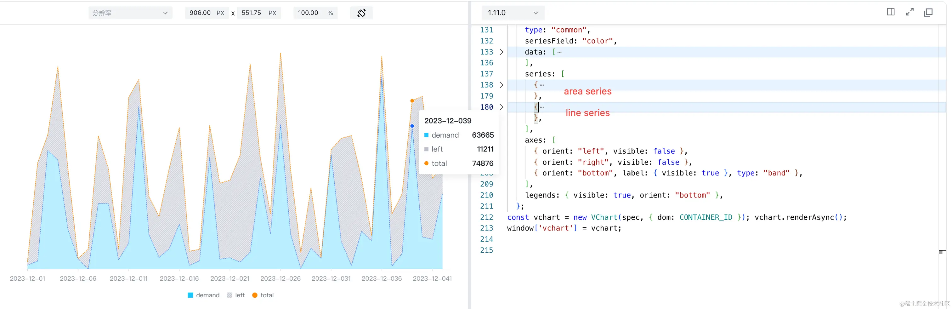 对于组合图中系列的层叠样式,可以通过series的声明顺序来控制,比如:如果line系列需要在area系列之上,那么则需要先声明area系列,然后声明line系列。