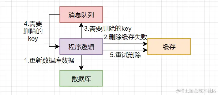 流程如下所示 (1)更新数据库数据; (2)删除缓存数据失败 (3)将需要删除的key发送至消息队列 (4)自己消费消息,获得需要删除的key (5)继续重试删除操作,直到成功