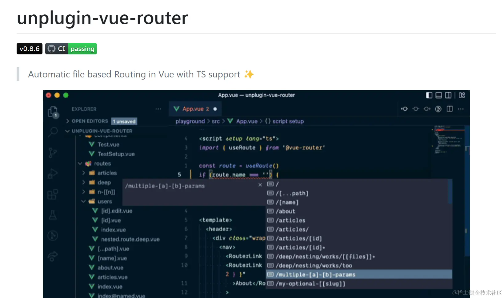 最后,Vue Router 也即将推出的一个新的扩展 unplugin-vue-router,这个扩展能让你实现获得 TS 支持的同时实现基于文件的路由,有兴趣的同学可以关注或贡献。
