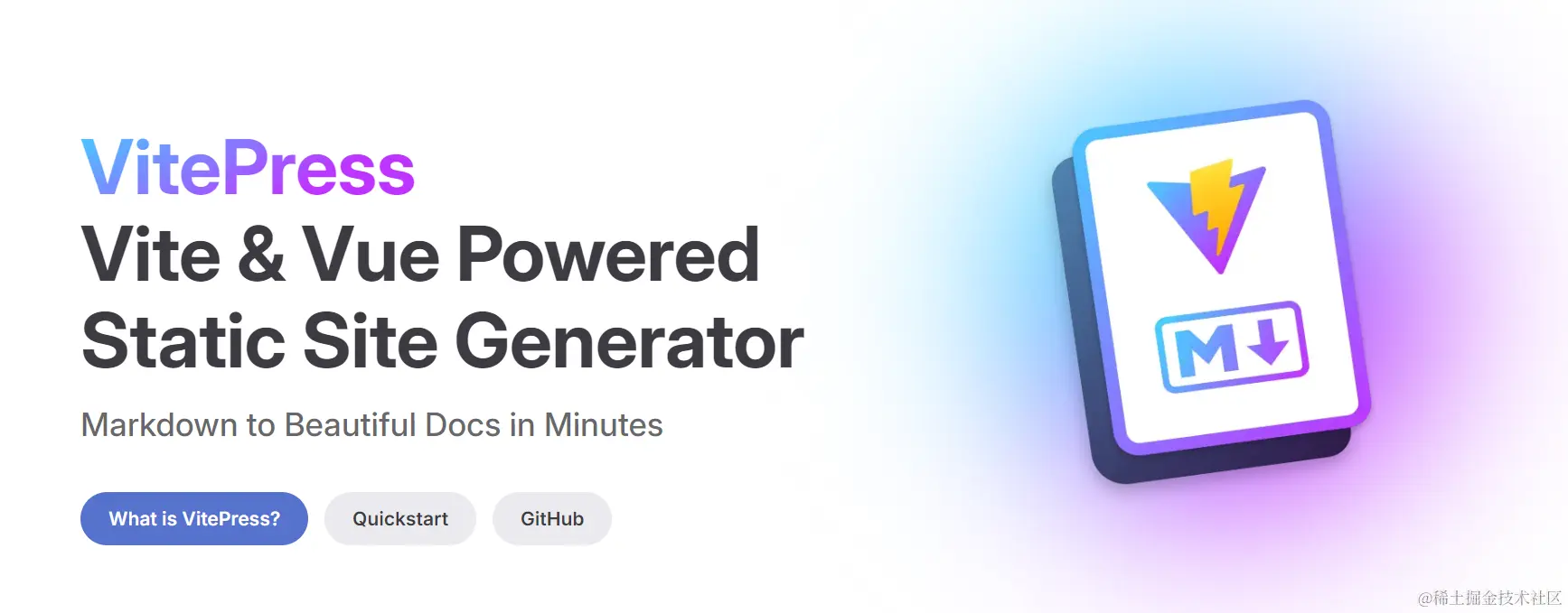 最后是 VitePress,这是一款 Vite + Vue 驱动的静态站点生成器(替代之前的 VuePress),简单几个 Markdown 文件即可在几分钟内创建很漂亮的文档。
