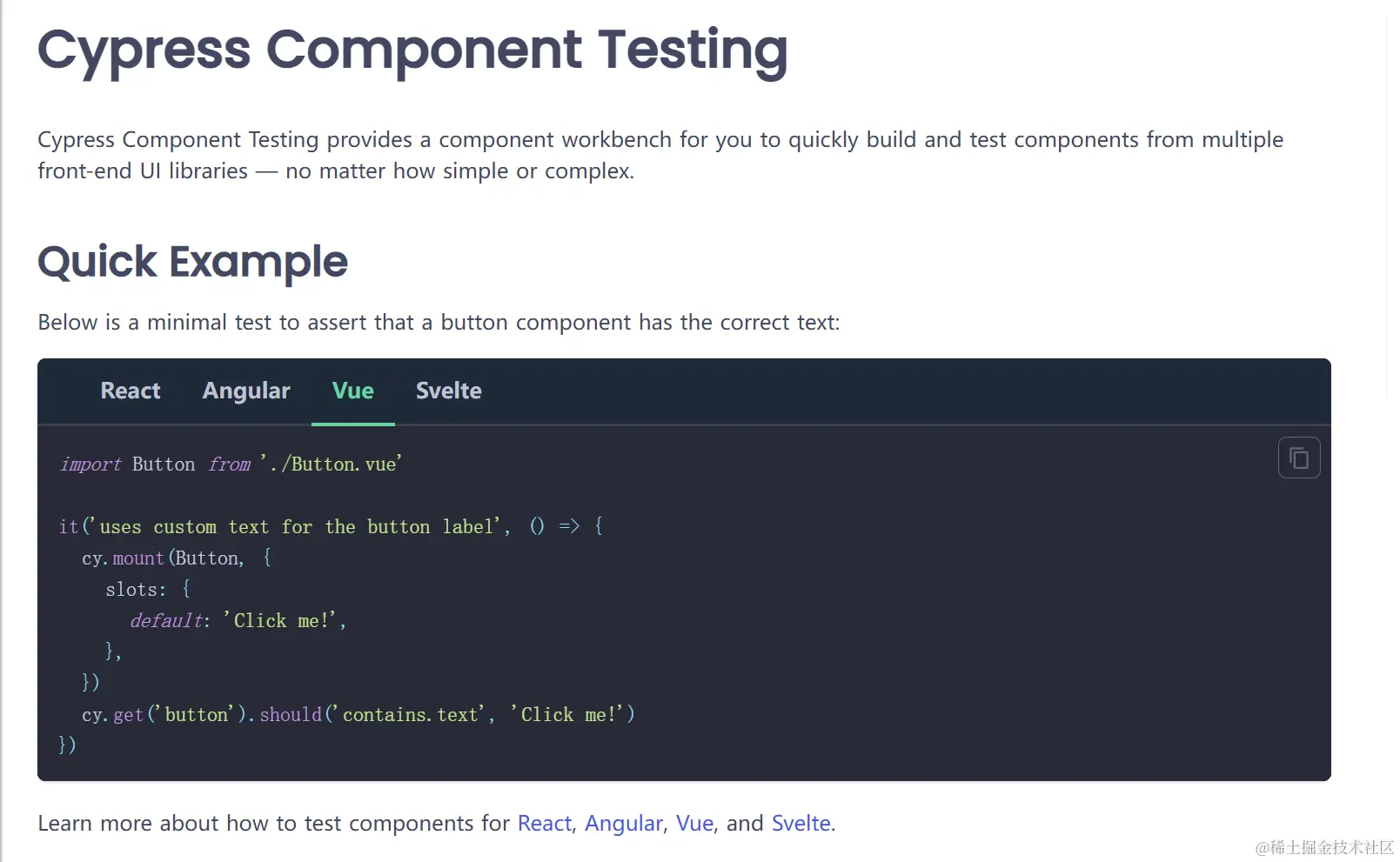 Cypress 非常适合用来测试组件是否正确渲染了样式或是触发了本机 DOM 事件,进而判断组件行为是否符合预期。