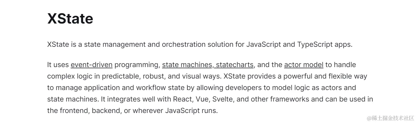 对于熟悉状态机的人来说,你可以会使用 XSt‘ate 来作为你项目管理状态的工具。在 XState 背后,它有一支出色的团队支持,并且一直受到社区的喜爱。