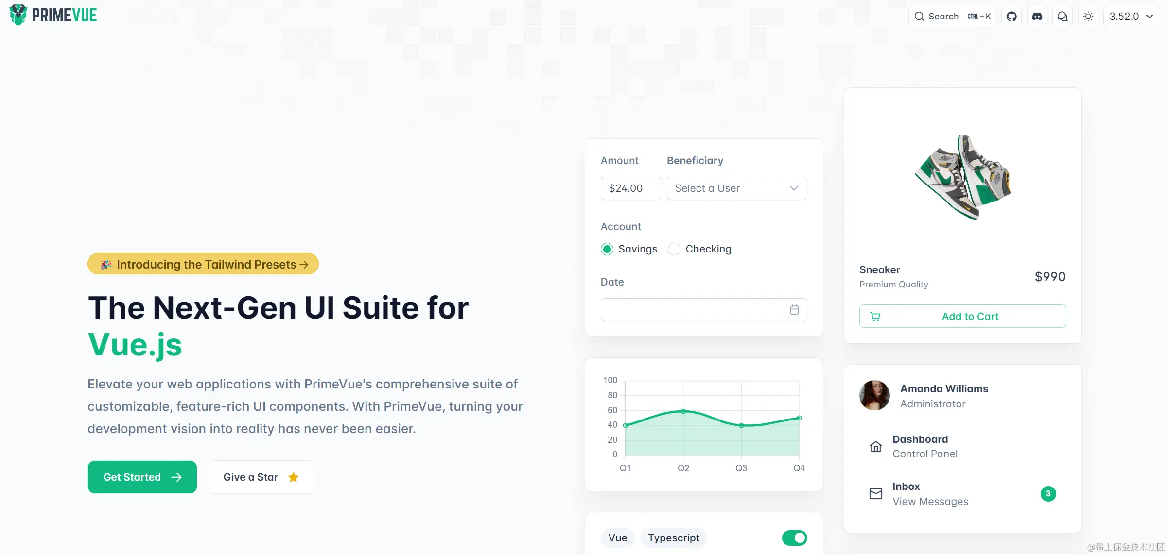 PrimeVue 是由 Vue.js 驱动的一套完整 UI 套件,由一组丰富的 UI 组件、图标、块和项目模板构成。通过提供可重用的解决方案来提高开发人员的工作效率,也方便作为内部库进行调整和自定义。