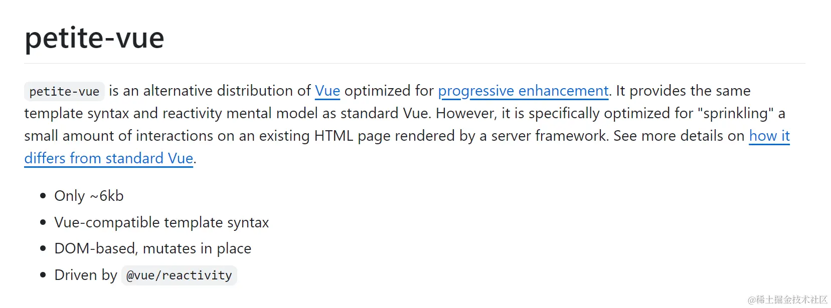 对于那些只需要 Vue 功能子集并且只想在页面上添加一些交互性的人来说,可以看看 petite-vue,它只有 ~6kb!
