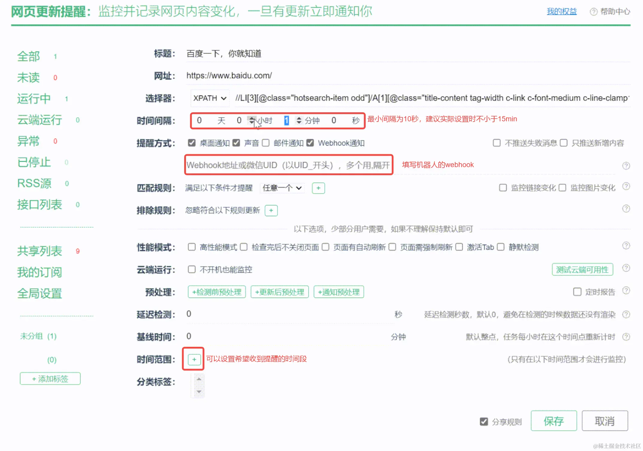 打开需要监控的网页,点击网页更新提醒的按钮,圈选想监控的区域(比如首条热搜),按需设置参数后保存。