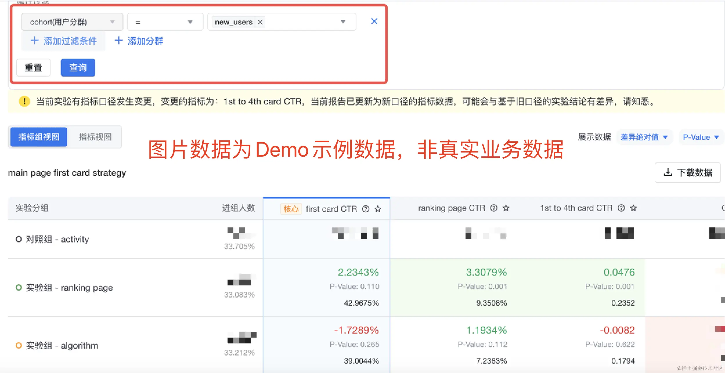 同时,在过滤了用户分群后,可以支持实时计算p-value和置信区间。