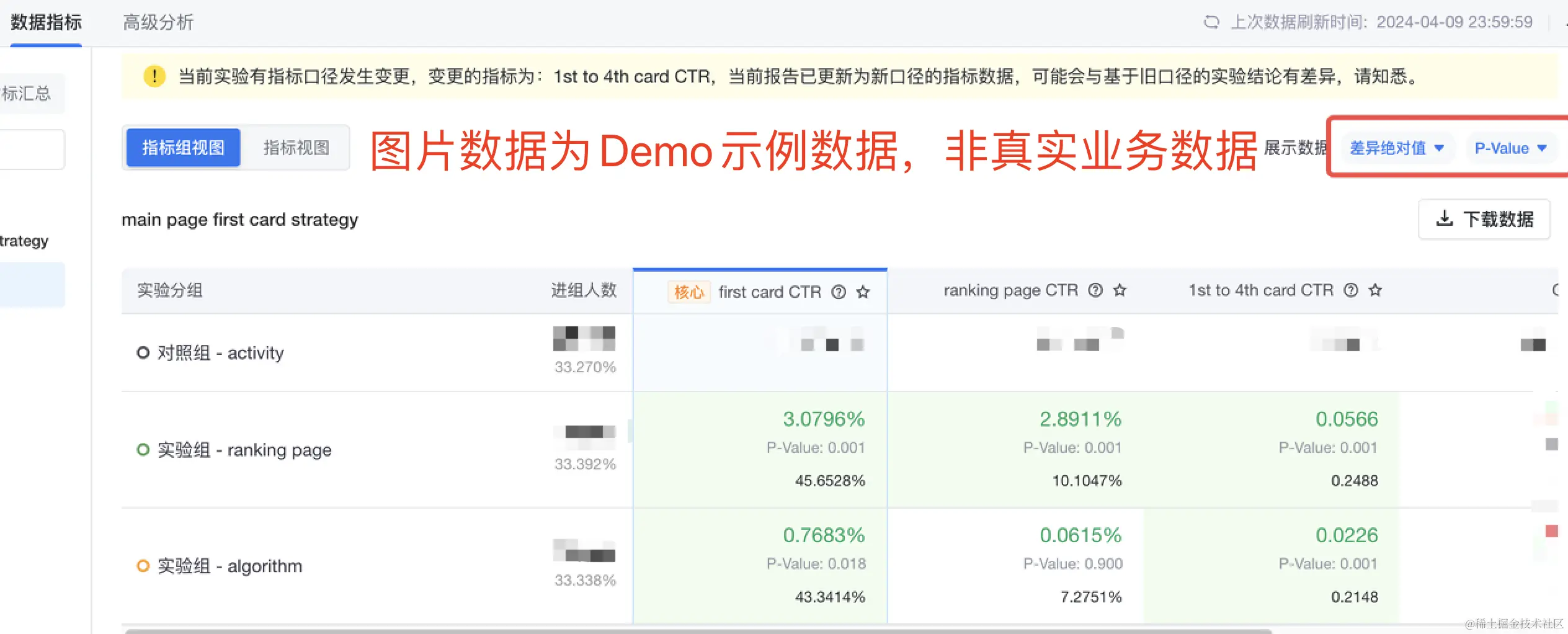 目前,火山引擎DataTester的指标看板页面可以切换差异绝对值以及p-value和置信区间切换,协助实验决策更好地理解指标变化。
