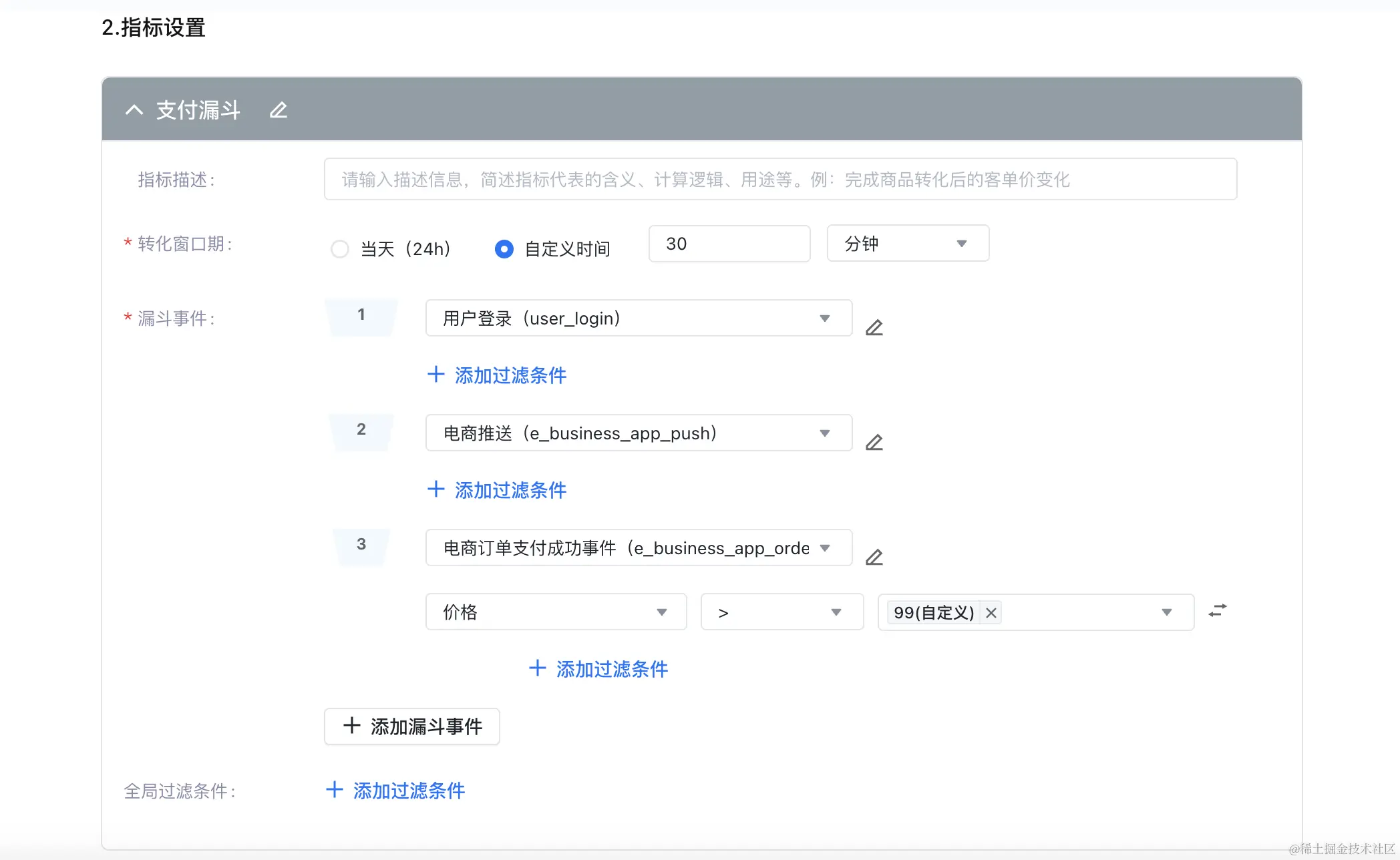 漏斗指标则是将一系列事件发生按顺序排列,判定一个用户在此顺序下发生这些事件,到达最后一步的转化率。这一指标类型对于基于流程场景的优化具有交大帮助,能够帮助企业精准定位影响用户转化的关键因素。