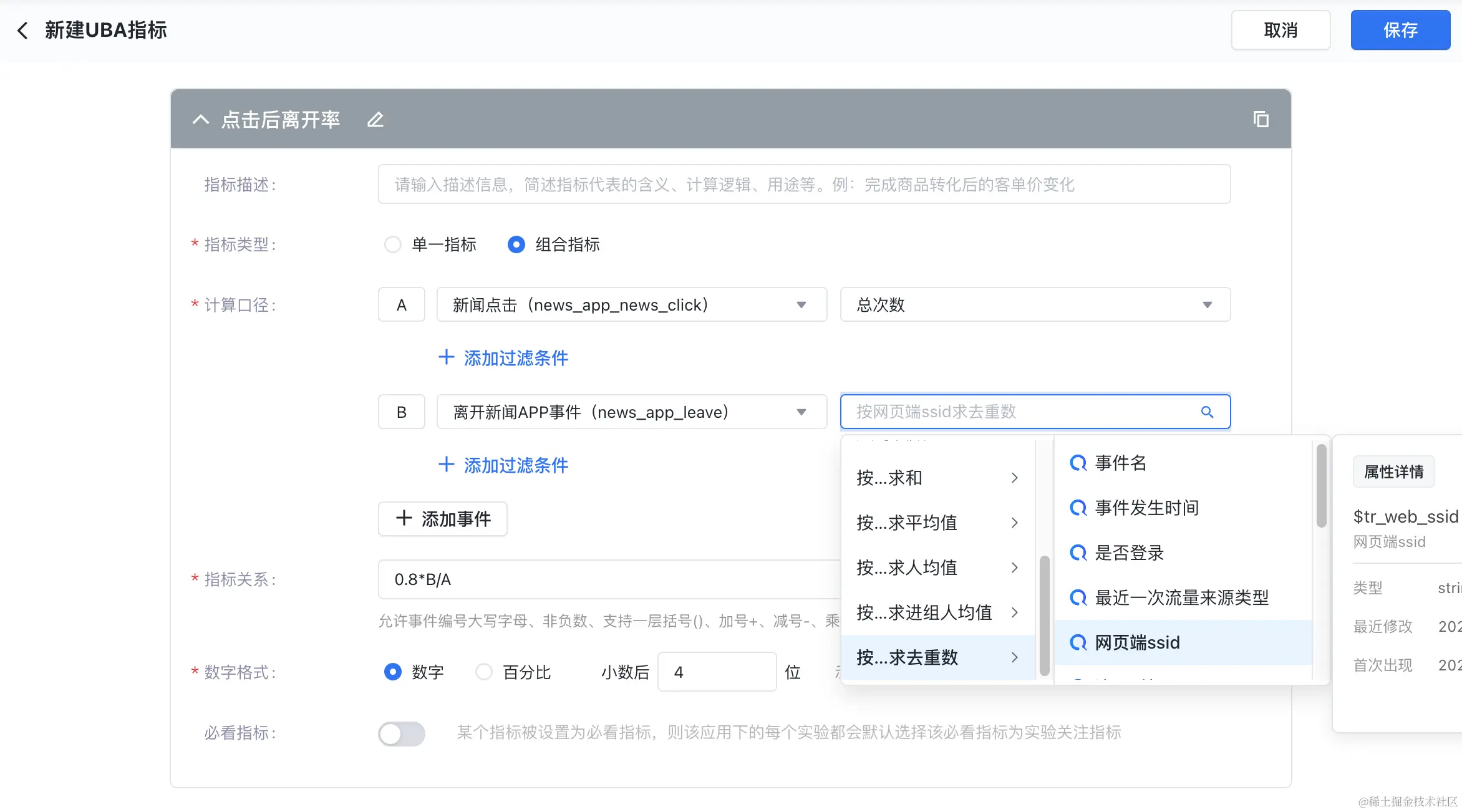 火山引擎DataTester的指标管理系统同样值得称道。该系统支持多种指标的计算方式,包括事件(算子)指标、留存指标和漏斗指标。其中,事件指标可以利用埋点上报的事件和算子(总次数、总人数、按...求和/求均值/去重数等)计算出的值来定义。现在,这些事件指标在“按某个属性去重”作为分母的情况下,也能支持置信度计算,提升了数据的准确性和可靠性。