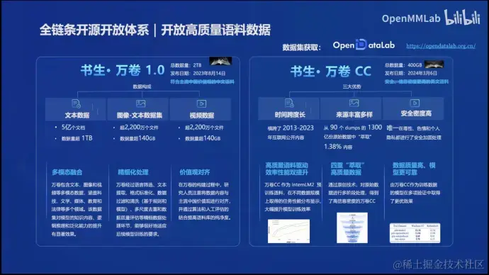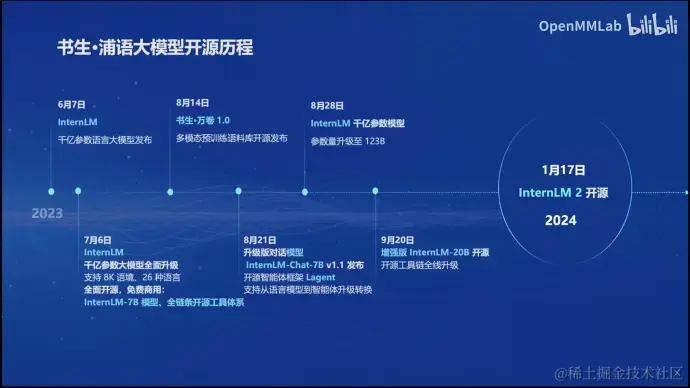 - 书生浦语大模型自发布以来,经历了快速迭代。包括升级千亿参数大模型、支持8K语境、推出全免费商用的7B开源模型和全链条工具体系、发布多模态预训练语料库、升级对话模型等。