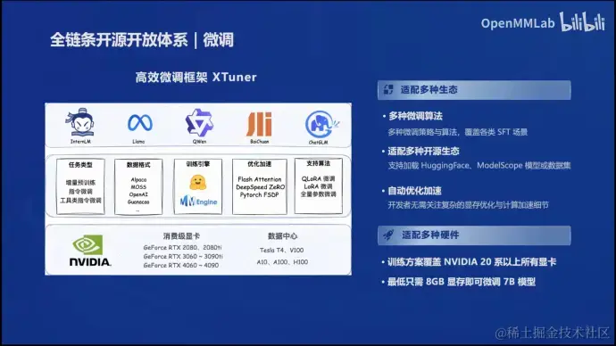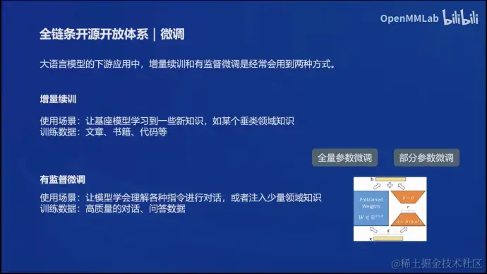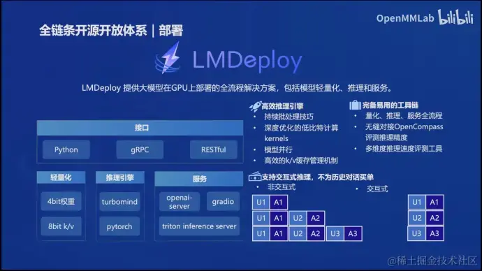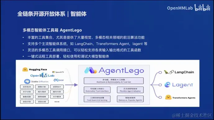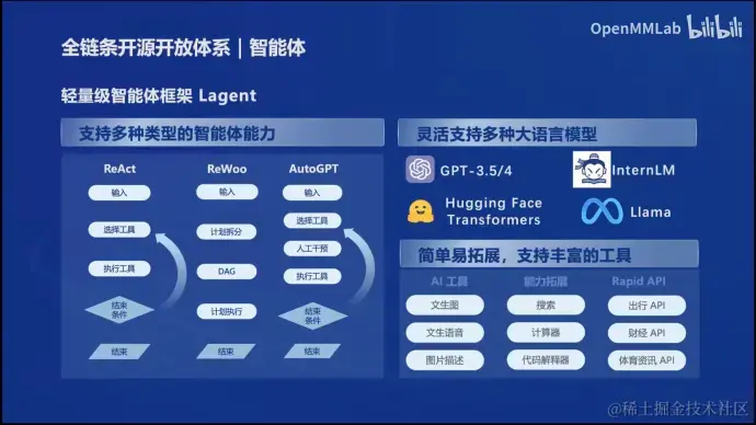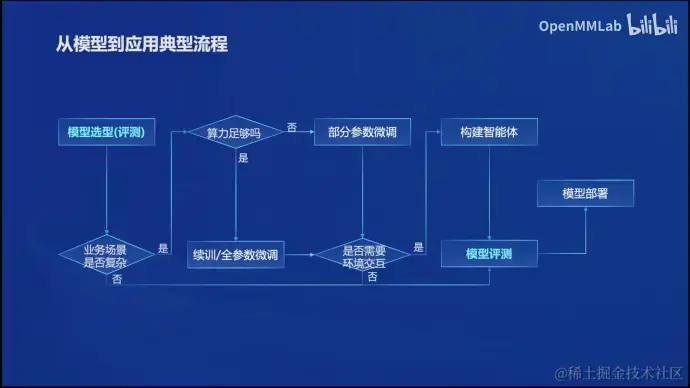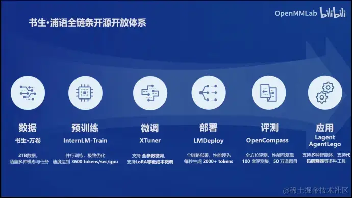 为了简化从模型到应用的过程,开发了全链条的工具体系并开源。这包括数据集、预训练框架、微调框架、部署解决方案、评测体系和智能体框架等。这些工具支持从数据准备、模型训练、微调、部署到评测的整个过程,旨在帮助开发者和研究者更容易地使用和开发大模型应用。