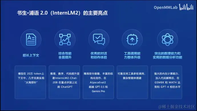 - 书生浦语大模型是一个全链条的开源体系,支持长达20万汉字的输入,是全球大模型产品中支持的最长上下文输入长度。模型具备超长上下文能力、推理数学代码能力、对话和创作体验,以及工具调用能力。