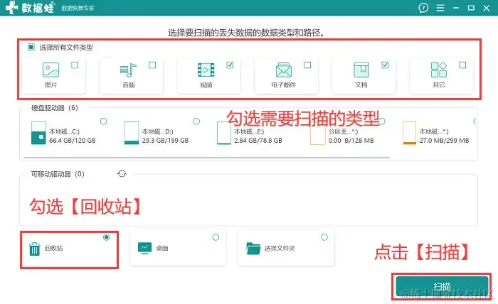 步骤2:勾选上需要扫描的文件类型,同时勾选上【回收站】 ,点击【扫描】;