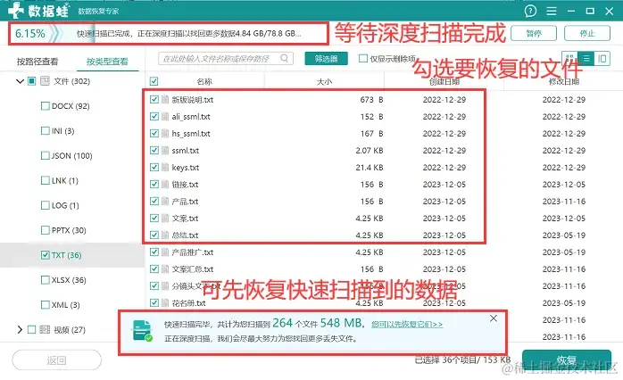 步骤3:扫描完成后,可以先对快速扫描到的数据进行恢复,并继续等待深度扫描完成;