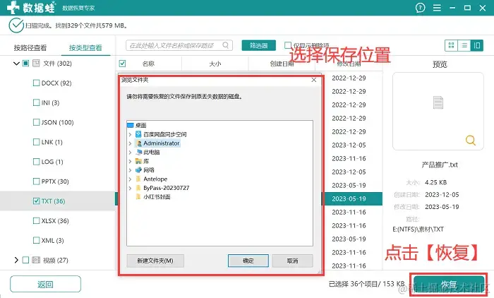 步骤4:完成深度扫描后,软件将呈现有机会恢复的数据,根据需要,将要恢复的数据勾选上,完成选择后,点击【恢复】,将文件保存在另一个位置即可。