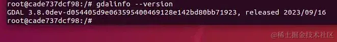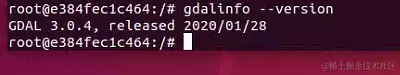 接下来,我们就进入了容器。此时,继续输入如下的代码,查看当前容器中GDAL库的版本信息。