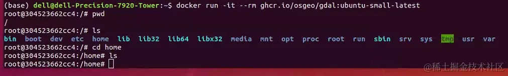 而如果我们并没有挂载文件,而是用了本文中第一次出现的那一句代码进入容器的代码,也就是前面的docker run -it --rm ghcr.io/osgeo/gdal:ubuntu-small-latest代码,进入容器后会发现,cd进入home文件夹后,再ls,是看不到我们这个cppGDAL文件夹的;换句话说,此时我们就没有办法在容器内部读取我们电脑里/home/dell/cppGDAL目录下的文件了——连文件、数据都无法获取,那么这个GDAL镜像肯定也是没有用处的了。