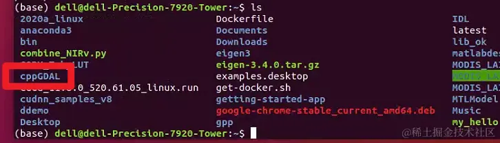 此外,前面我们还提到,-v /home/dell/cppGDAL:/home/dell/cppGDAL这一个部分可以保证镜像可以且仅可以读取/home/dell/cppGDAL目录下的文件,而不会读取到我们没有挂载的其他文件夹。针对这一个内容,我们再做一个对比。如下图所示,是我们直接在Ubuntu电脑的终端中,进入/home/dell目录的情况;可以很明显地看到,在电脑中的/home/dell目录下,不仅有我们的这个cppGDAL文件夹,还有很多很多其他的文件或者文件夹;而在上上图中,可以看到在容器中,我们进入/home/dell/cppGDAL目录下只能看到这个cppGDAL文件夹,而看不到电脑中这一路径下原本还有的其他文件或者文件夹。所以很明显,相当于我们就是可以在镜像中访问/home/dell/cppGDAL目录,但是无法访问没有挂载的其他文件夹,从而保证了其他无关文件夹的安全性。