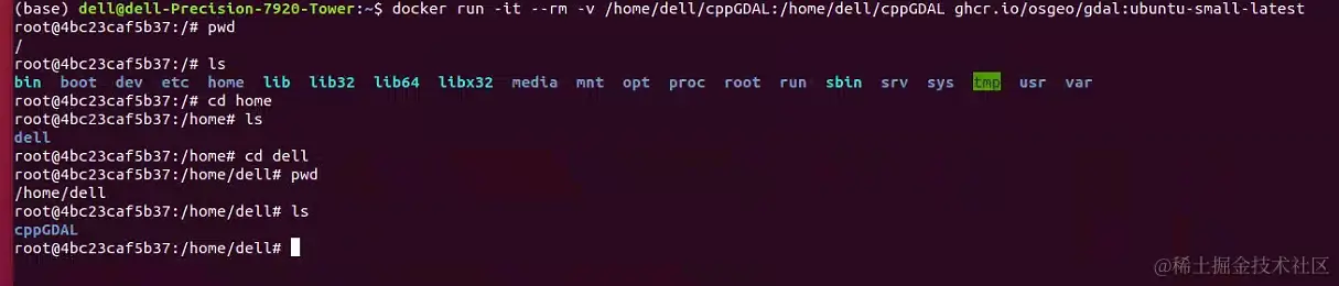 为了更清晰地看到前述那一种进入容器的代码的意义,我们做一个如下的对比。如下图所示,这是我们用了那一句包含挂载文件夹命令的代码,进入我们的容器后,执行的操作;可以看到,此时在容器中,我们就可以进入/home/dell/cppGDAL目录下。