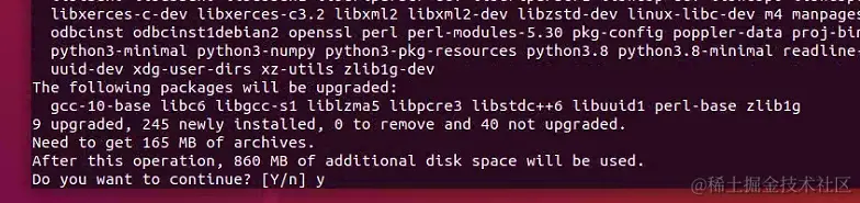 随后,输入如下的代码,配置GDAL模块的C++ 库。其中,libpq-dev是PostgreSQL数据库的开发库,包含了开发PostgreSQL应用程序所需的头文件和静态库;gdal-bin是GDAL的二进制工具包,提供了一些用于处理地理空间数据的工具,如转换、裁剪等;libgdal-dev是GDAL的开发库,包含了开发GDAL应用程序所需的头文件和静态库。