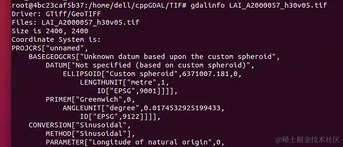 明白了上述内容,就可以开始我们的GDAL操作了。例如,我这里在/home/dell/cppGDAL目录下还有一个名称为TIF的文件夹,其中保存了一景遥感影像,那么我就可以通过gdalinfo语句,查看这一栅格数据的信息。如下图所示。