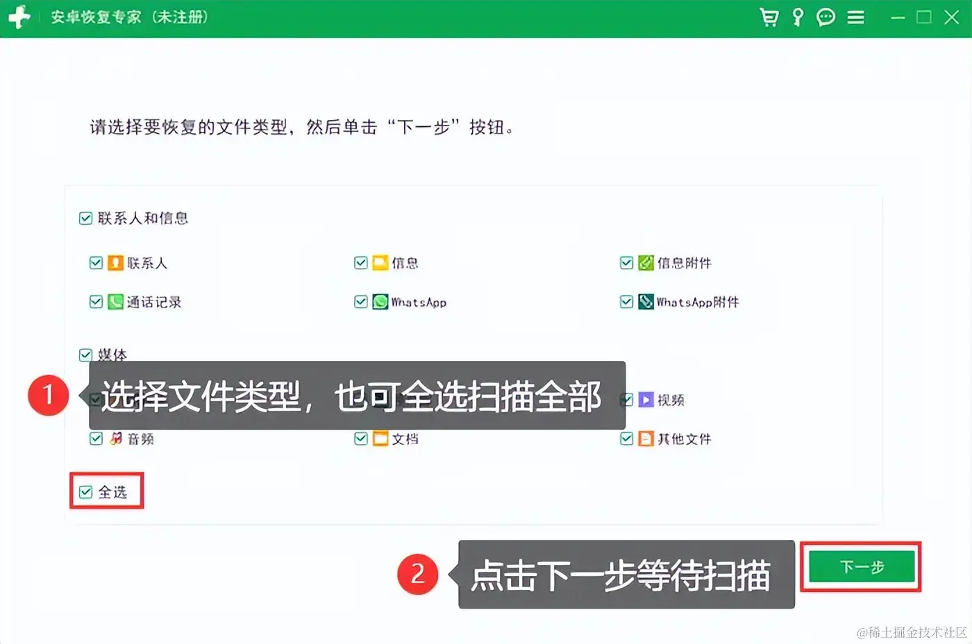 步骤2:在电脑页面中选择文件类型,即需要恢复的数据类型,然后点击 【下一步】 ,等待软件扫描华为手机内的数据。