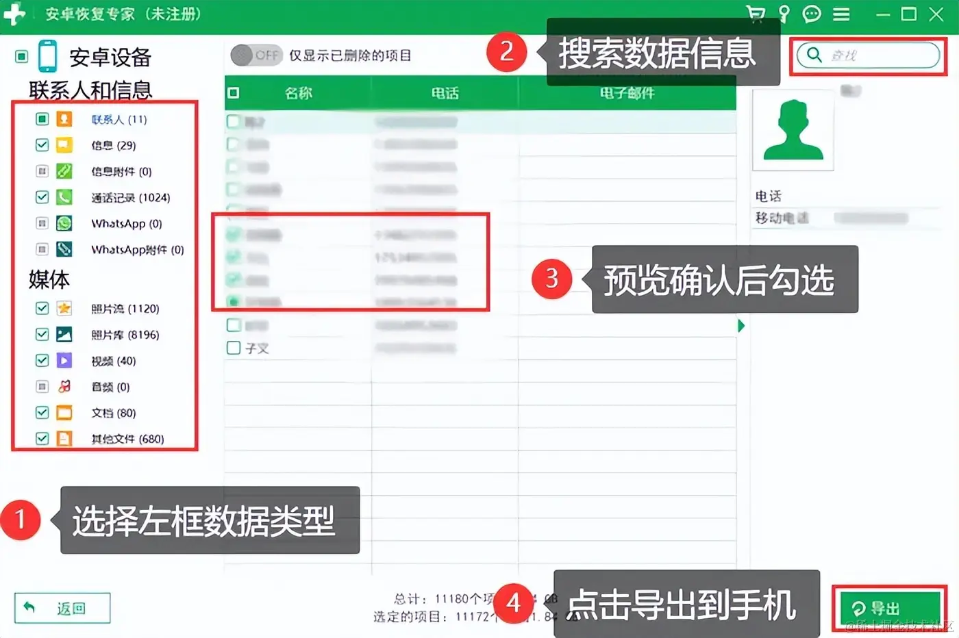 步骤3:在扫描完成的页面中可以选择需要恢复的对象,也可以根据关键词搜索查找,勾选完成后点击 【导出】 ,使数据还原到电脑中合适的文件位置。
