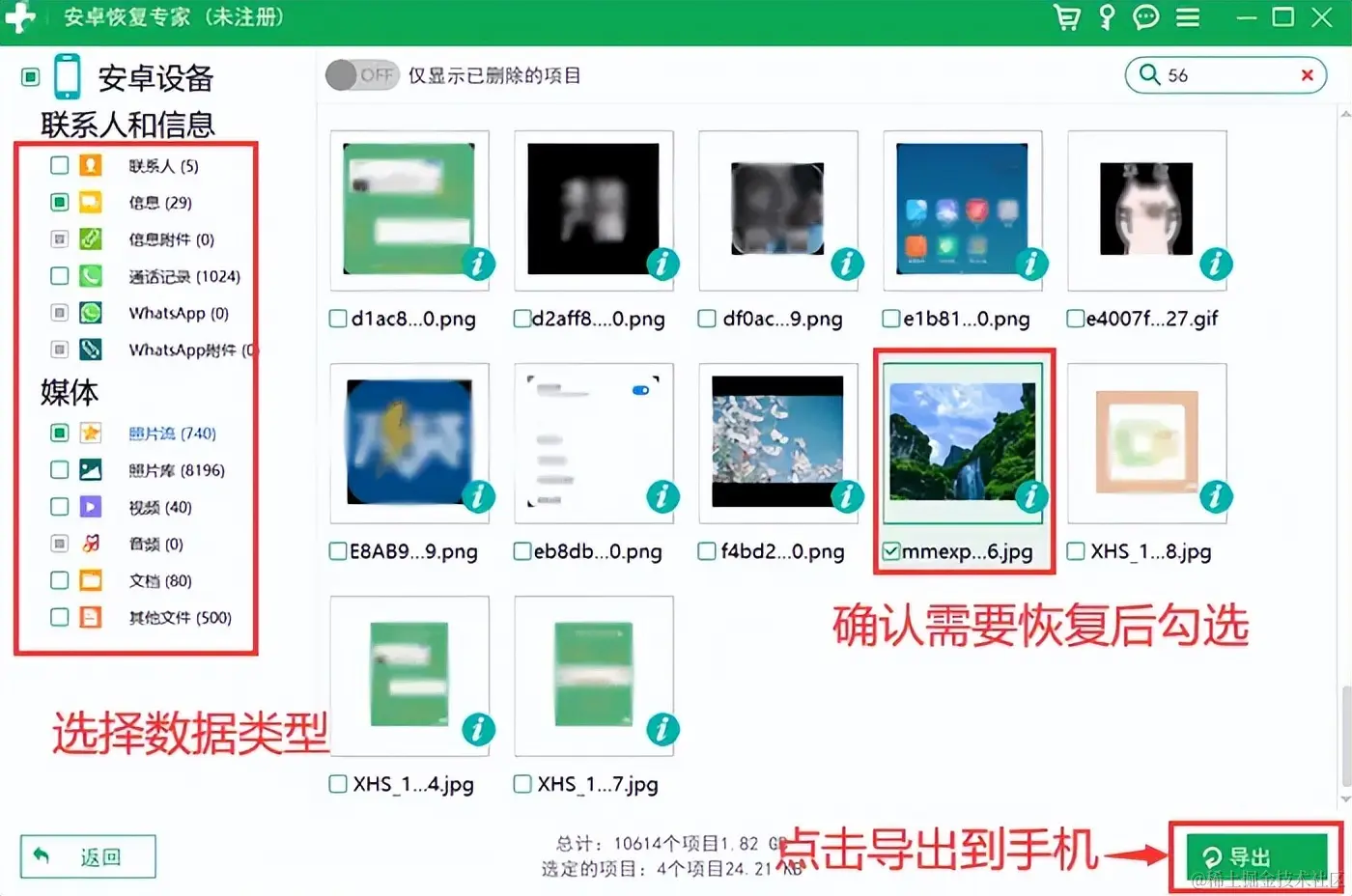 第三步:在扫描完成的列表中我们可以根据关键词来搜索数据,预览完毕之后可以勾选需要恢复的对象,然后点击右下角的 【导出】 按钮,等待数据恢复到电脑。