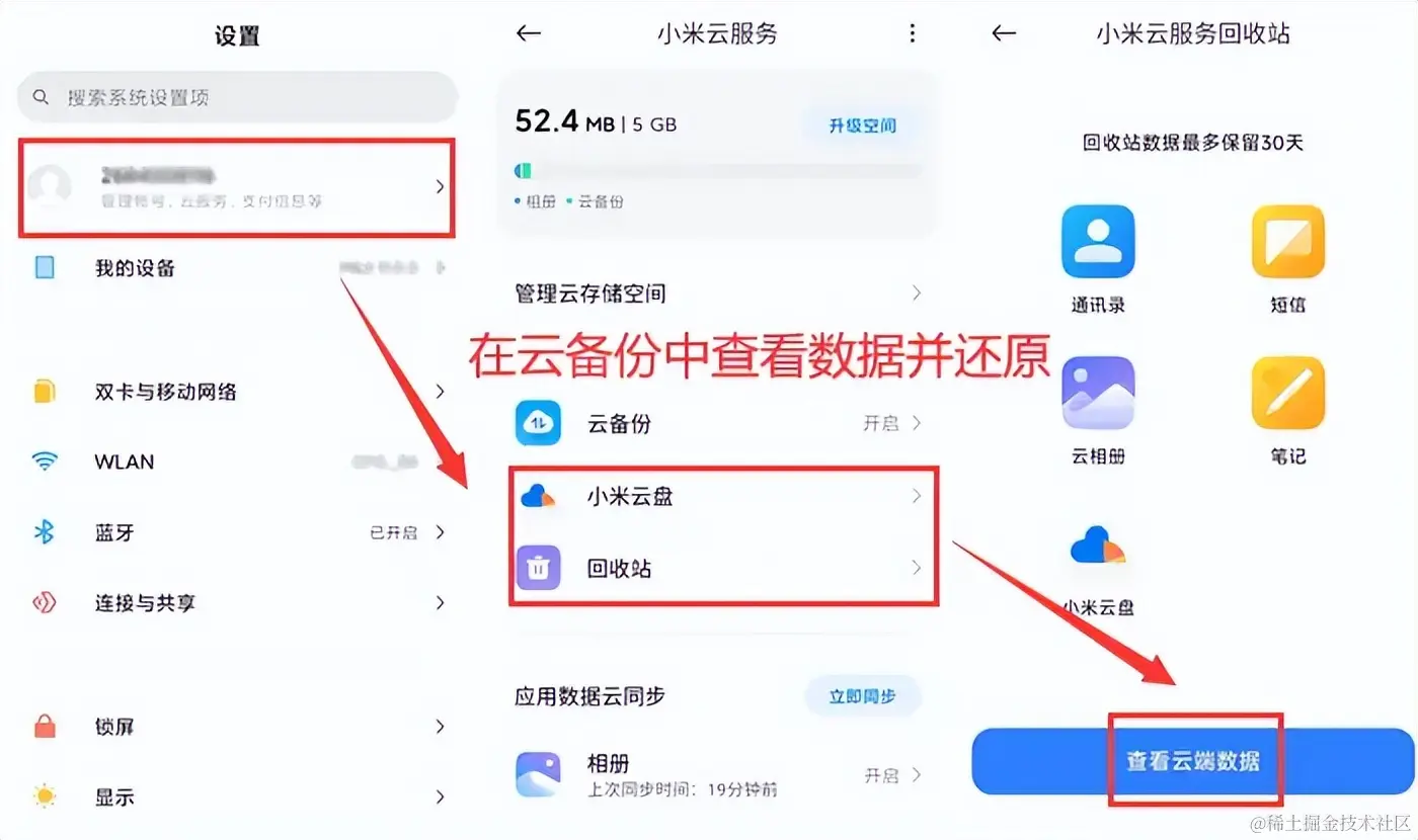 第二步:在云服务中查看备份,点击想要恢复的数据类型并恢复即可。