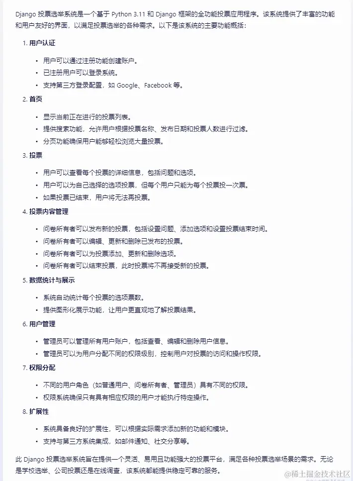 Django 投票选举系统是一个基于 Python 3.11 和 Django 框架的全功能投票应用程序。该系统提供了丰富的功能和用户友好的界面,以满足投票选举的各种需求。以下是该系统的主要功能概括: