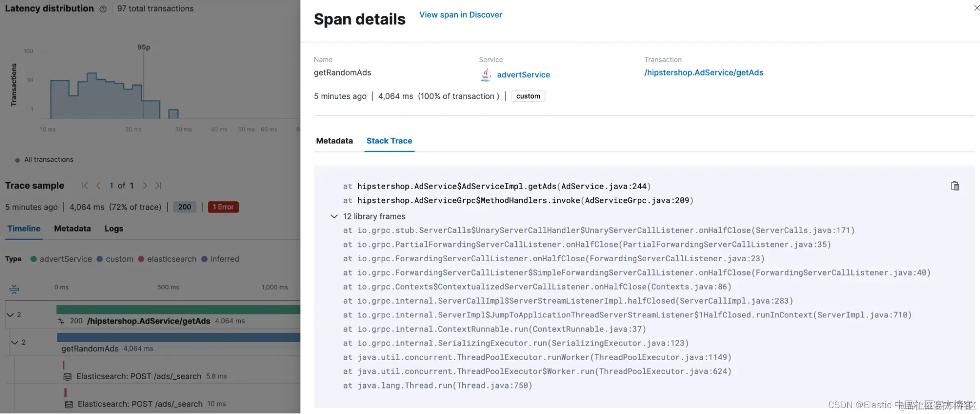 在许多情况下,分布式跟踪内的跨度相对粗粒度,特别是当不使用推断跨度等功能时。 准确理解跨度在代码路径中的起源位置非常有价值。 为了满足这一需求,OTel Java 代理的 Elastic 分发包括跨度堆栈跟踪功能。 此功能通过收集超过可配置的最小持续时间的跨度的相应堆栈跟踪来提供重要的见解,准确地指出代码中跨度的启动位置。