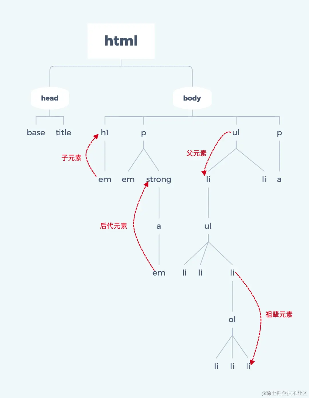 如上图所示,相邻的两个节点(层级是连续的),他们之间是父子关系。如果两个元素之间跨越两个层级以上,它们是祖辈和后代的关系。