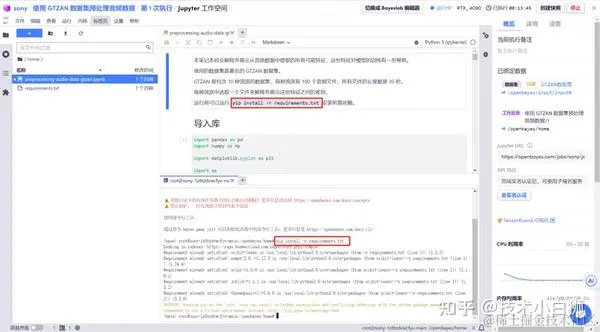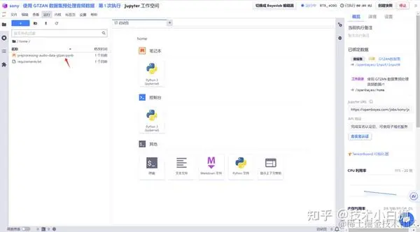 进入到工作空间后,在左侧文件管理器中选中 ipynb 结尾的 notebook 文件,并将启动页拖下并打开「终端」。