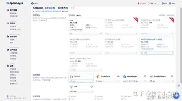 点击「下一步:选择算力」,选择 RTX 4090 的算力和 PyTorch 的镜像。