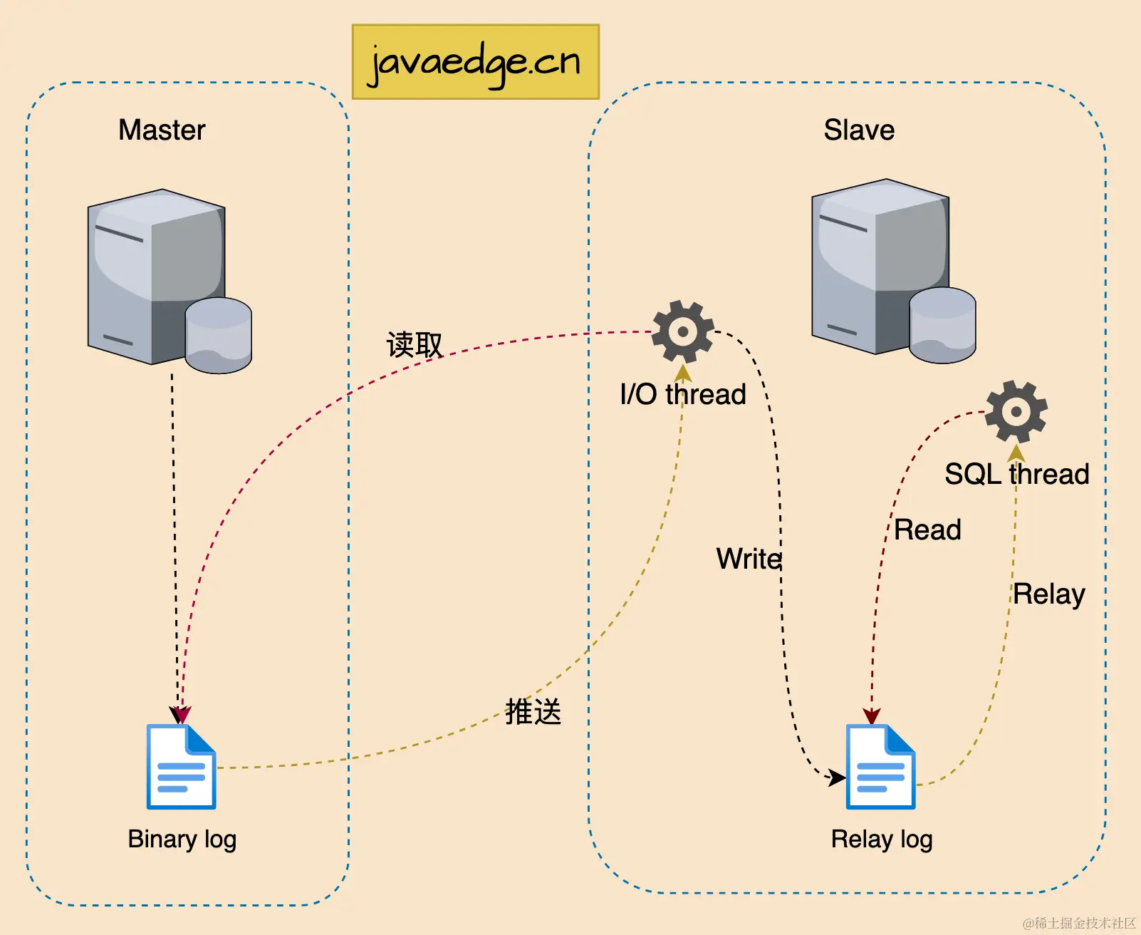 - MySQL slave 将 master 的 binary log events 拷贝到它的中继日志(relay log)
