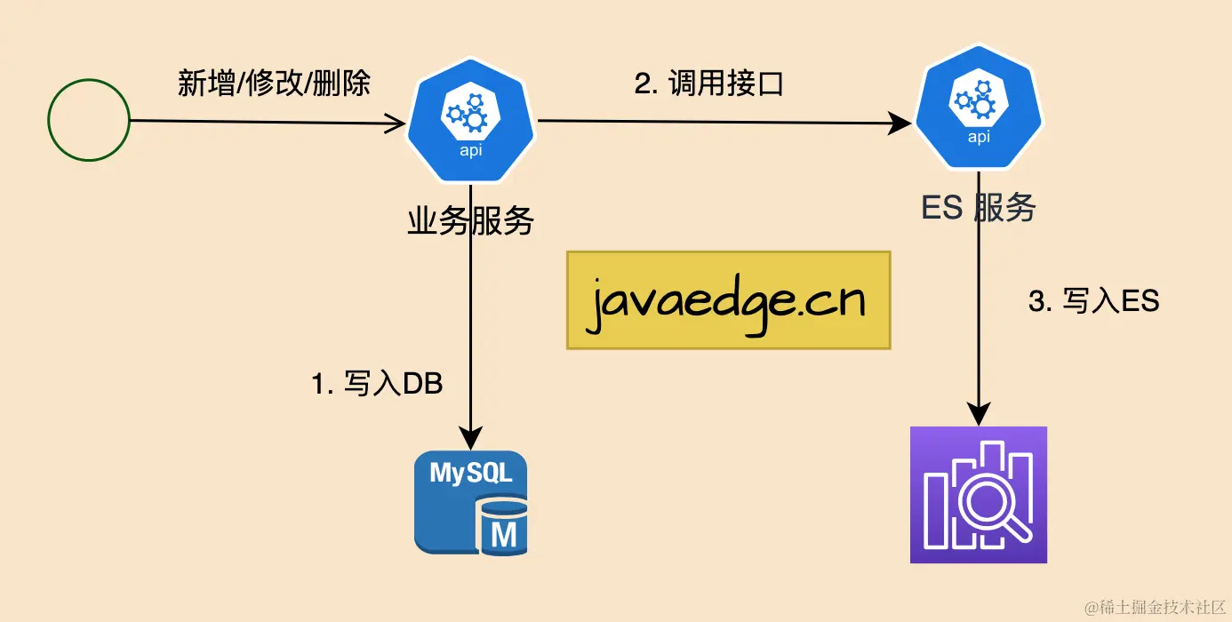 最简单方案,在将数据写到MySQL时,同时将数据写到ES,实现数据双写。