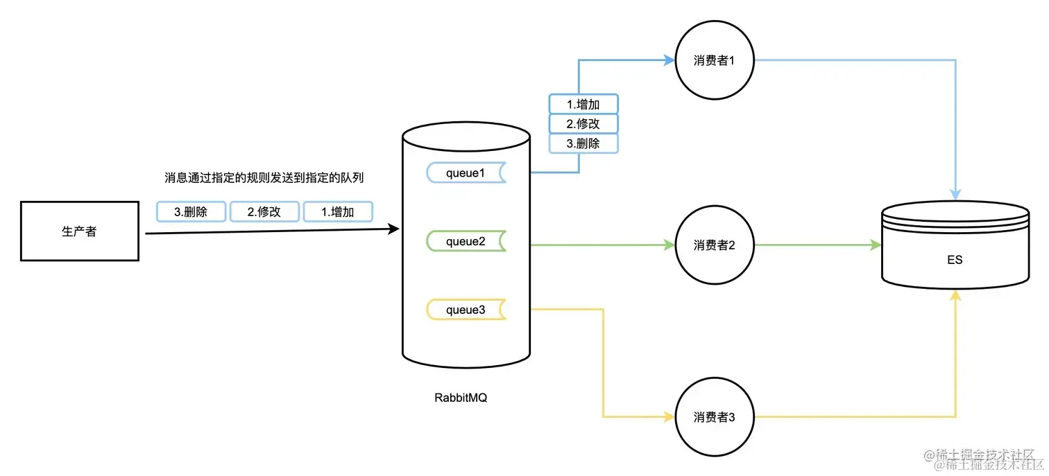 RabbitMQ消费顺序错乱原因通常是队列消费是单机多线程消费或消费者是集群部署,由于不同的消息都发送到了同一个 queue 中,多个消费者都消费同一个 queue 的消息。如消费者A执行增加,消费者B执行修改,消费者C执行删除,但消费者C执行比消费者B快,消费者B又比消费者A快,导致消费 binlog 执行到ES时顺序错乱,本该增加、修改、删除,变成删除、修改、增加。