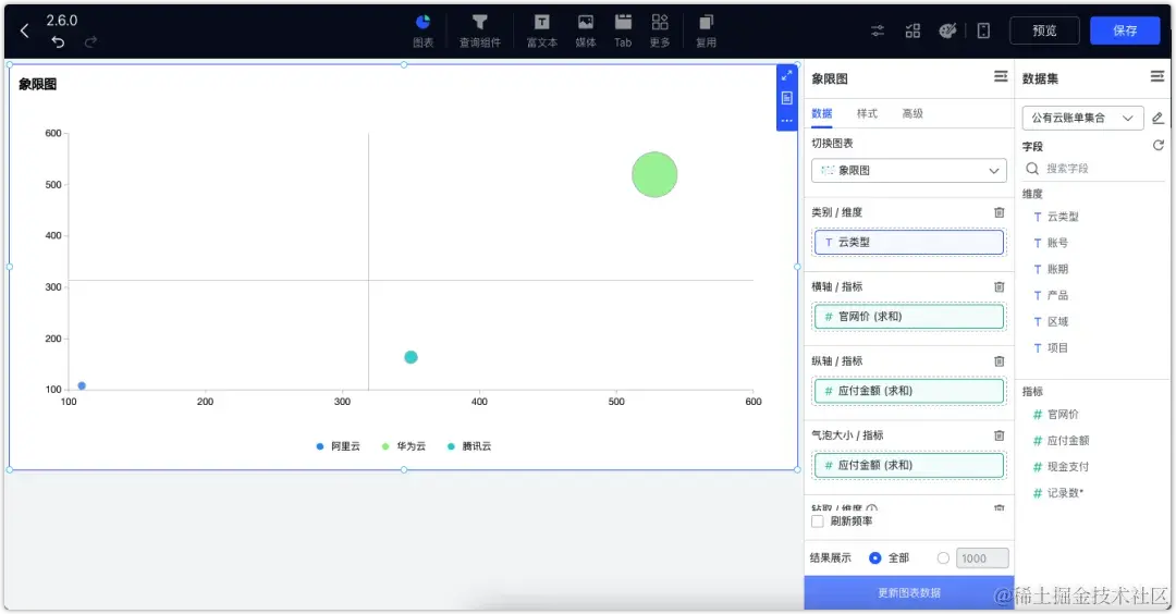 DataEase v2.6.0版本还新增了“象限图”组件。象限图上的四个区域分别代表了数据的不同表现或特征组合,有助于用户快速识别数据中的模式、趋势和异常。