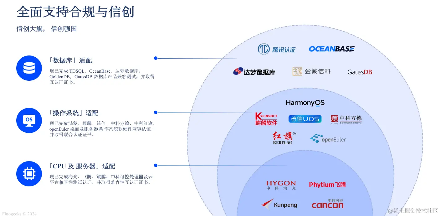 为全面支持国产操作系统的生态建设,国产化发展。凡泰极客旗下小程序平台 FinClip 已经完成了与「统信服务器操作系统(UOS)V20」、「麒麟软件NeoCertify」、中科方德「方德高可信服务器操作系统V3.1/V4.0」、OceanBase V3、腾讯云数据库 「TDSQL MySQL 版 V10」、龙芯、兆芯、飞腾等国产主流芯的适配,为在更广泛领域的深度应用打下了坚实基础。