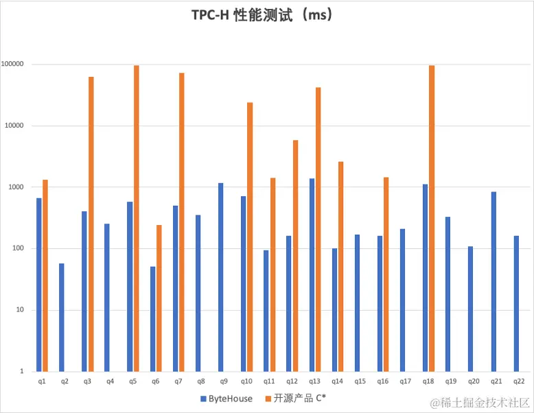 在之前发布的《云原生数据仓库ByteHouse性能白皮书》中,ByteHouse基于 SSB 100G、TPC-H 100G、TPC-DS 100G 数据集进行性能测试,在查询效率方面的显著成果。以TPC-H 数据集举例,在相同硬件和软件环境下, ByteHouse 查询效率高于本次基准测试产品几十倍。