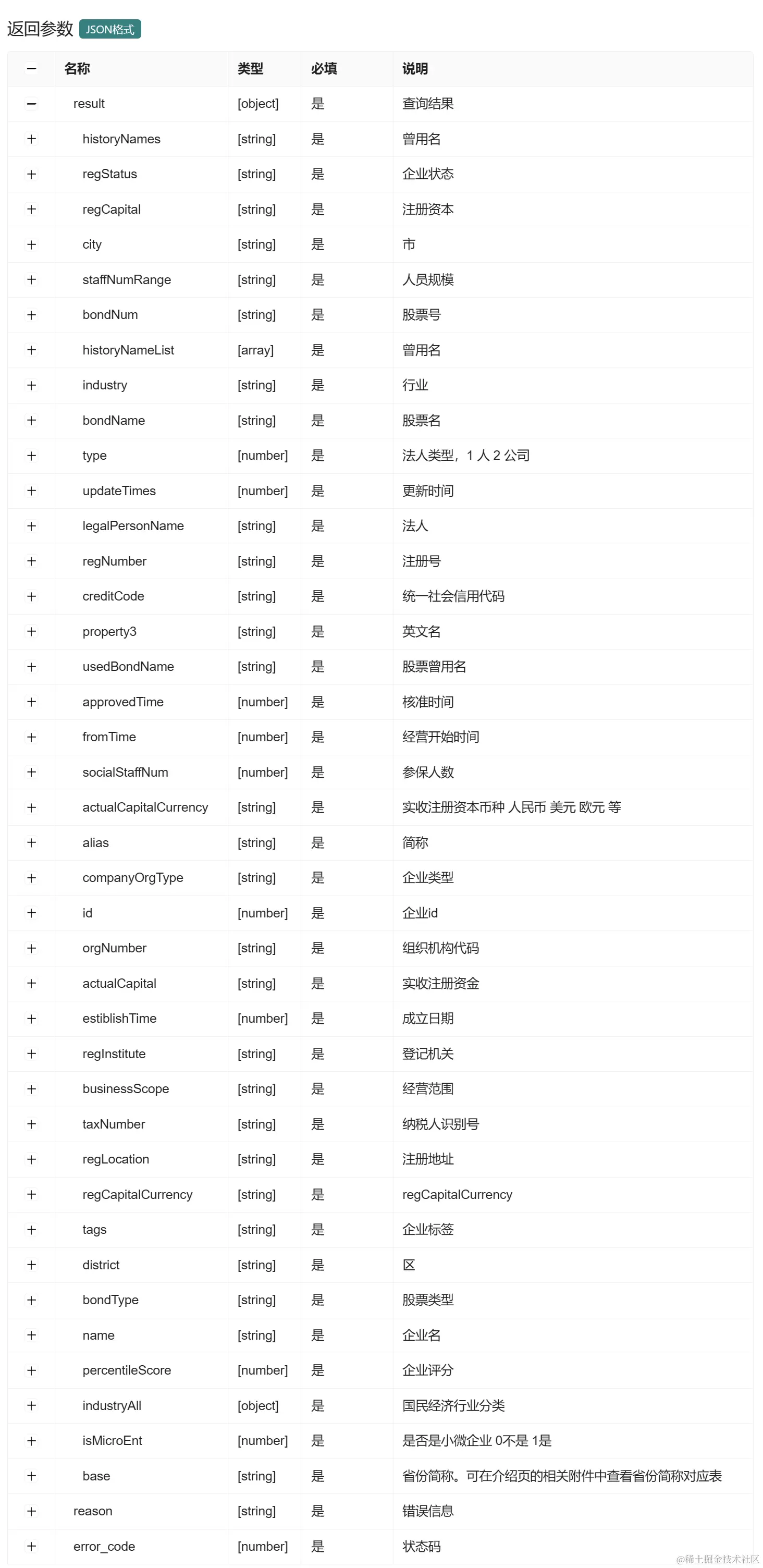 这里我推荐的是 APISpace 的 企业基本信息API,通过公司名称/公司ID/注册号或社会统一信用代码获取企业基本信息,企业基本信息包括公司名称或ID、类型、成立日期、经营状态、注册资本、法人、工商注册号、统一社会信用代码、组织机构代码、纳税人识别号等字段信息。