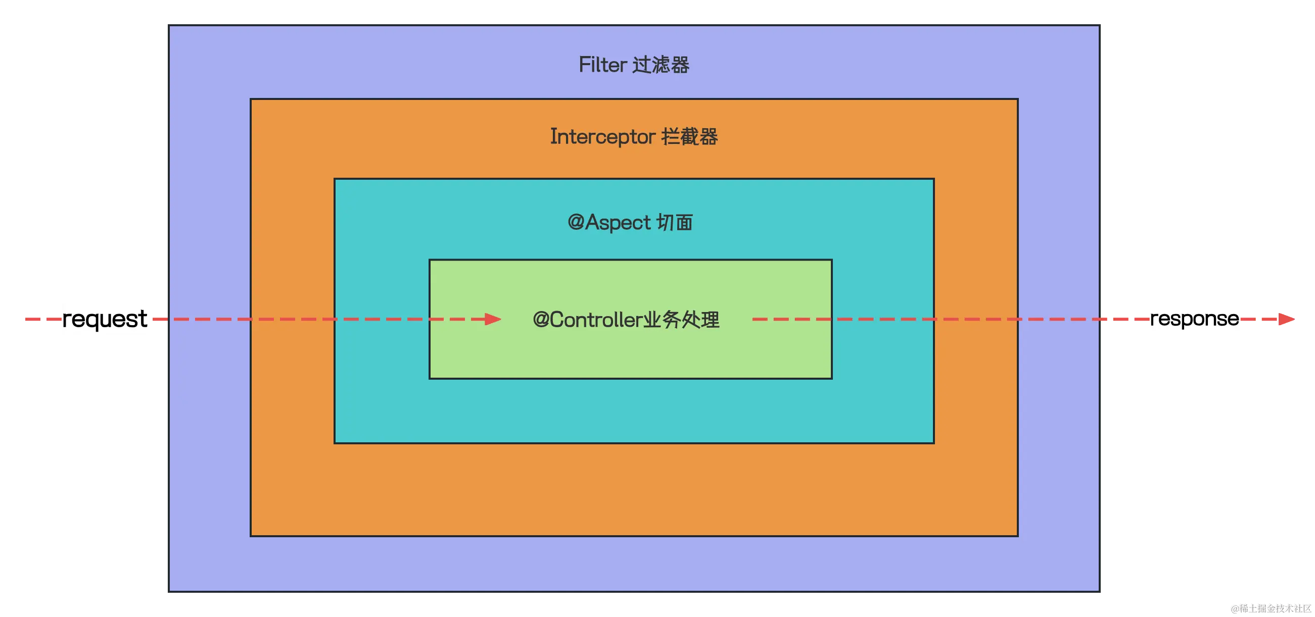 过滤器、拦截器、@Aspect切面都是aop思想的一种体现,具体使用选择的话建议根据项目需要,参考它们的特性及执行顺序,选择最合适的一个或多个进行使用,个人觉得三者几乎都能实现相同的需求功能,比如接口权限检验,参数日志记录等等