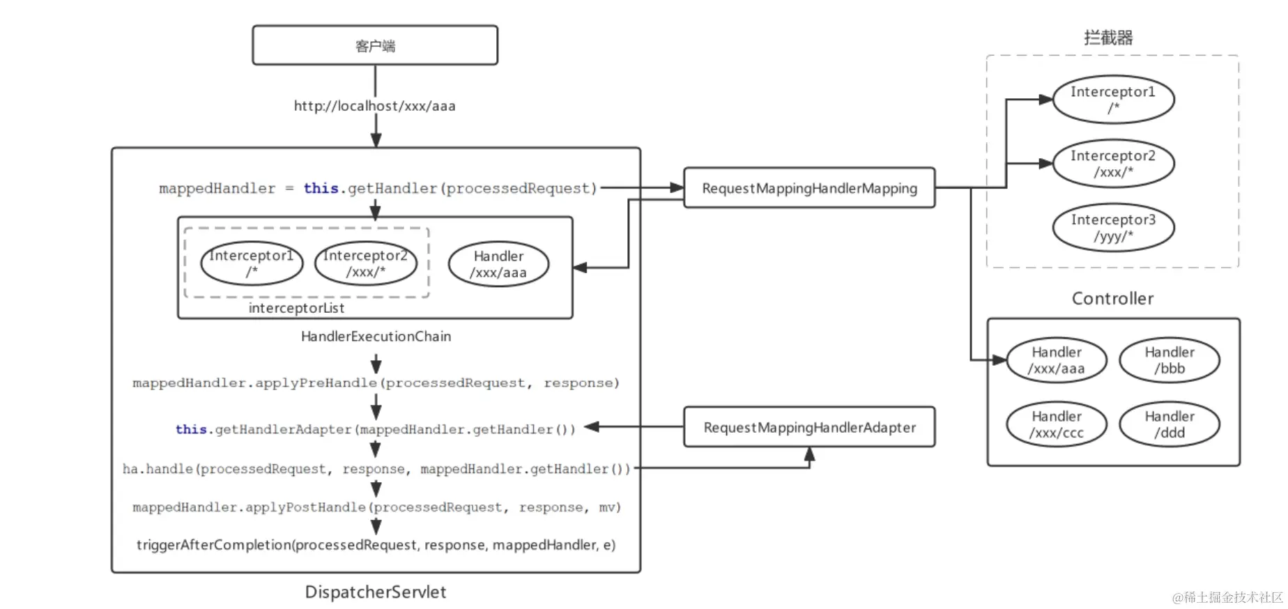 Handler和多个Interceptor被封装成一个拦截器链HandlerExecutionChain的对象,最后来到DispatcherServlet的doDispatch方法中执行拦截器