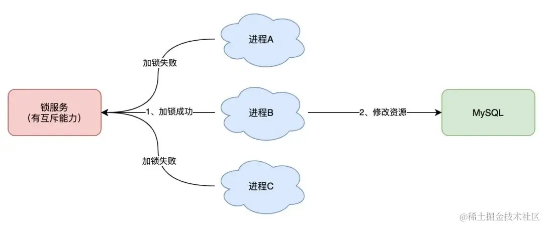 而这个外部系统,必须要实现「互斥」的能力,即两个请求同时进来,只会给一个进程返回成功,另一个返回失败(或等待)。