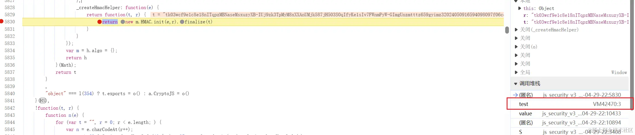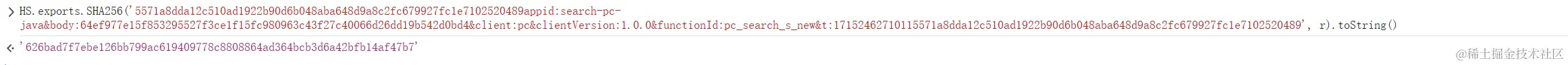 不过我们不知道他走的是哪个加密函数,我们可以通过 HS 对象下的加密函数来一一确认,也可以在其他的加密函数上打上断点,可能有的大佬可以直接秒,哈哈,已经确认走的是 SHA256 加密函数: