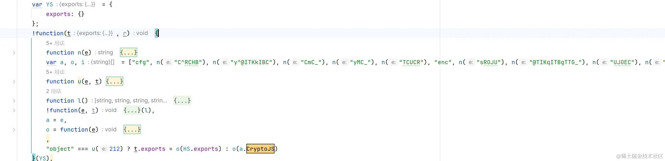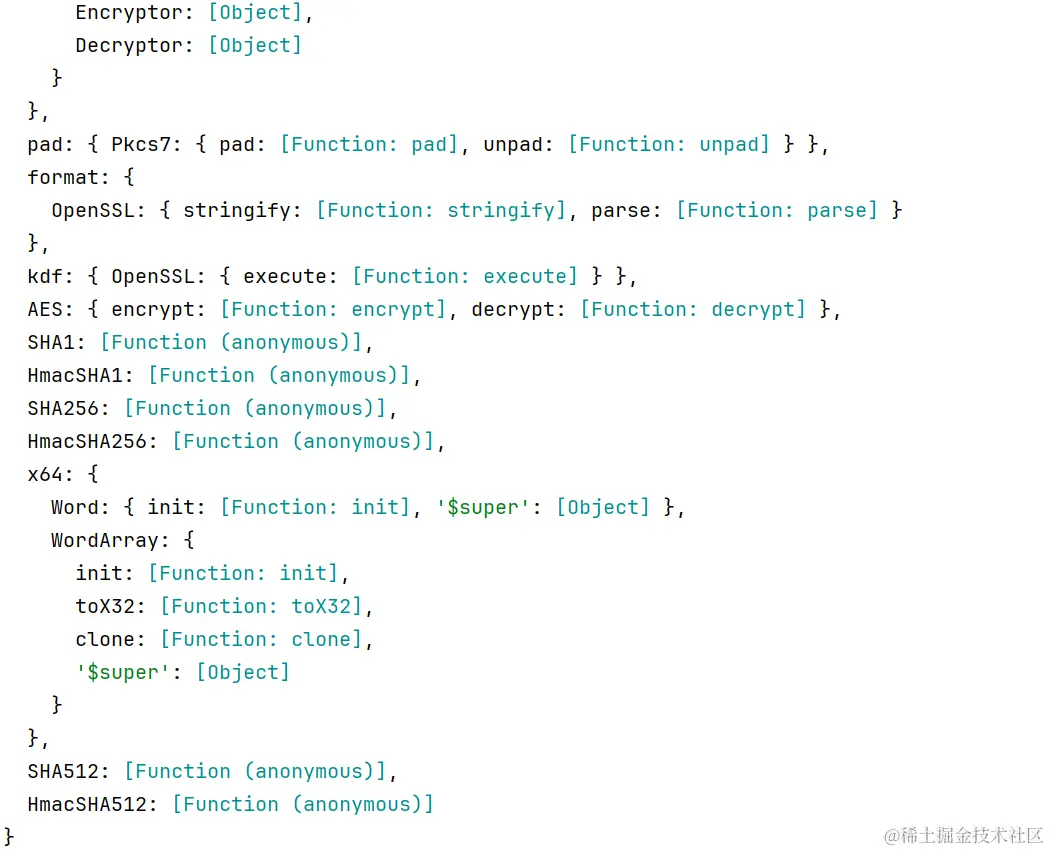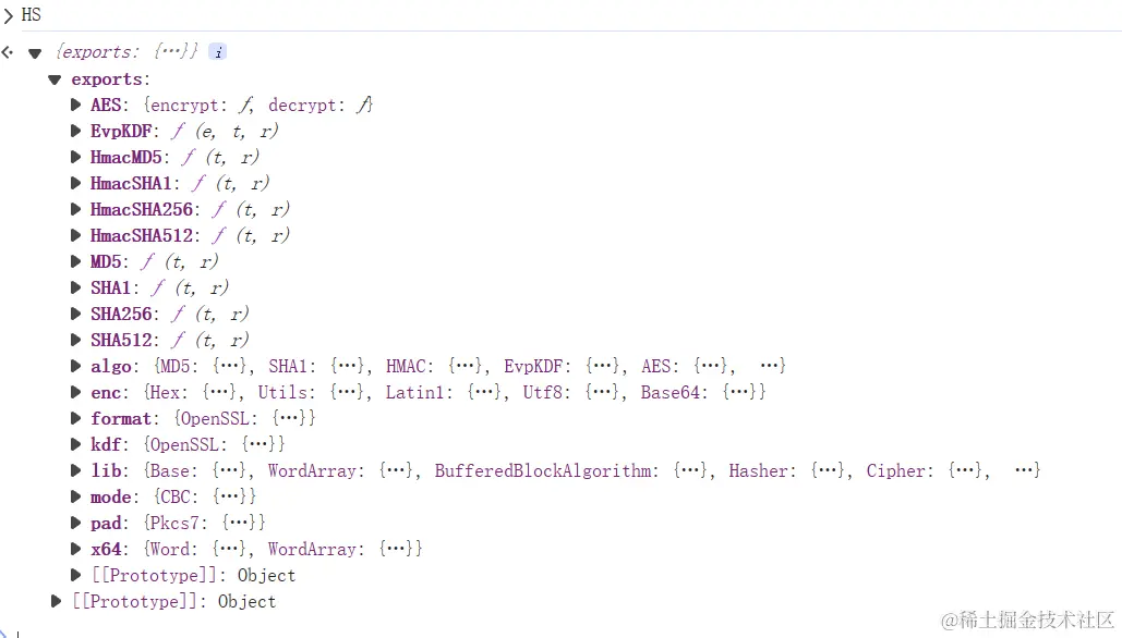 可以发现里面还有标准的 ob 模式的混淆,主要导出的加密函数就是 o 函数,初始直接将 o 函数的返回值,赋值给 HS 对象,后续就传入 HS 对象到 o 函数再进行导出,所以 HS 对象应该包含所有的加密函数。