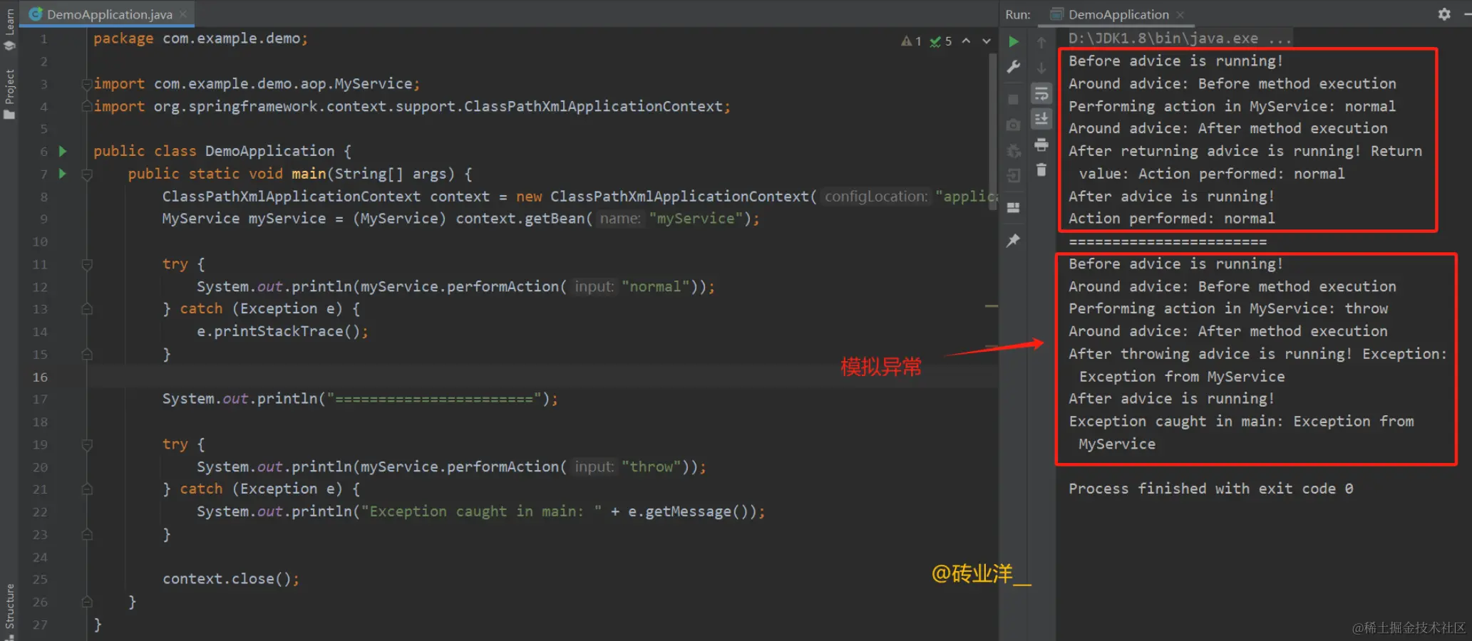 Pointcut)的表达式来识别和匹配的,execution(* com.example.demo.aop.MyService.performAction(..))表达式定义了一个切点,它指定了一个明确的连接点集合——即MyService接口的performAction方法的所有调用。这个例子中,MyService接口的performAction方法的调用就是潜在的连接点。每次performAction方法被调用时,就达到了一个连接点。这个连接点就是这里通知应用的时机。
