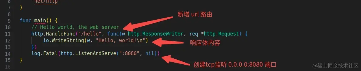 这是一个非常简单代码片段,首先新增了路由,并对请求响应返回一段字符串,最后监听8080端口等待请求连接。